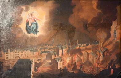 Keywords: Vœu des habitants de Rennes à Notre-Dame-de-Bonne-Nouvelle, tableau de la basilique saint Sauveur (Rennes, Ille-et-Vilaine, France).jpg PM35000468 Copie d'un ex-voto offert par les habitants de Rennes après l'incendie de la ville en 1720 cm 410 305 1721 aquarelle canvas wood Institution Basilique Saint-Sauveur de Rennes Première travée du bas-côté sud Vœu fait à N D de Bonne Nouvelle par les habitants des Lices rues St Louis St Michel Place Ste Anne préservées de l'incendie du 22 déc jusqu'au 30 caption bottom fr Leroy-Pinxit signature verso bottom left la Copie d'une aquarelle originale de Jean-François Huguet Photographie prise avant la restauration du tableau en 2013 artwork license PD-old-100 Édouard Hue photo date 2011-11-04 photo license CC-0 Own Uploaded with UploadWizard Le Vœu des habitants de Rennes à Notre-Dame-de-Bonne-Nouvelle