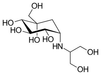 Keywords: Voglibose structure.svg voglibose trade names Basen Glustat codenamed AO 128 AO-128 ” an alpha-glucosidase inhibitor used in the management of diabetes mellitus own Yikrazuul 2010-09-12 thumb left valid svg Voglibose