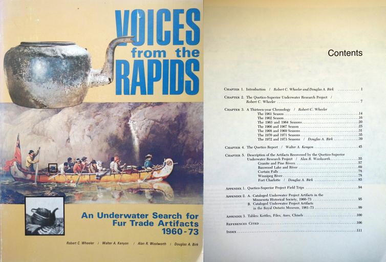 | Keywords: Voices of Rapids, by Wheeler, Kenyon, Woolworth, Birk, 1975.jpg Robert C Wheeler Walter A Kenyon Alan R Woolworth Douglas A Birk Voices from the Rapids An Underwater Search for Fur Trade Artifacts 1960-73 Part of cover is pixelized for copyright reasons Russel w Fridley Director June Drenning Holmquist Assistant Director for Research and Publications Publication of the Historical Society Minnesota Historical Archeology series No 3 St Paul ISBN 0-87351-086-0 On the cover The small teakattle pictured was recovered in the early 1960s by Dr E W Davis and divers Donald Franklin and Curtis Anderson from a small rapids between Gunflint and Little Guntflint lakes It is very similar to one portrayed by artist Frances Ann Hopkins 1838-1918 in her view of a North canoe passing along high rocky cliffs Mrs Hopkins often accompanied her husband secretary to the governor of the Hudson's Bay Company on such canoe journeys through the North American wilderness which she then depicted with beauty and accuracy The teacattle is owned by the Minnessota Historical Society; the painting is reproduced with permission of the Public Archives of Canada Ottawa Collection G C Franke 1975 Robert C Wheeler Walter A Kenyon Alan R Woolworth Douglas A Birk PD-text PD-old Collection G C Franke Furs in 1975 Fur traders Furs literature English Wheeler 1975 books from the United States Book covers from the United States |