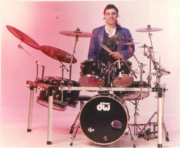 Keywords: VOLPINI.JPG es Foto prensa Daniel Volpini artista Pearl own Danielv 1992 la foto es usada en mi propio sitio Men with drum-kits Drummers Drum Workshop