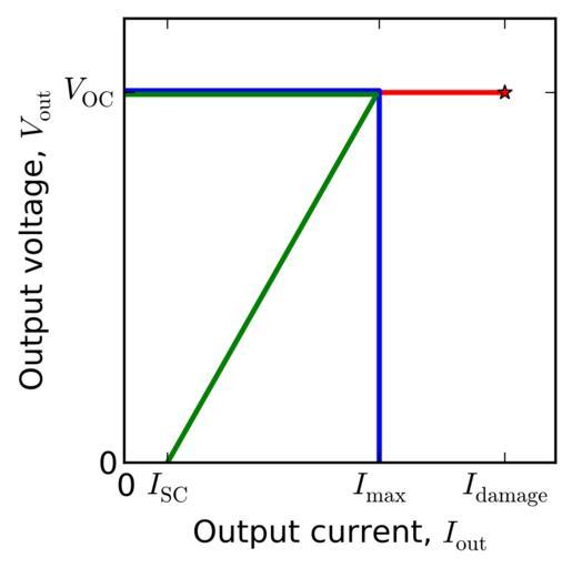 | Keywords: Voltage regulator foldback.svg en Voltage regulator V-I curves for foldback current limited and unlimited 2013-08-01 15 37 04 own Nanite Source Created with Matplotlib Requires matplotlib Due to a bug in wikipedia's SVG renderer the raw files appear with curves peeking outside of the axes Before uploading the files were touched up by releasing and re-setting the clip paths <source lang python > from pylab import figtype ' svg' saveopts 'bbox_inches' 'tight' 'transparent' True 'frameon' True seterr divide 'ignore' V_fb concatenate linspace 9 95 9 95 100 endpoint False linspace 9 95 0 101 I_fb concatenate linspace 0 0 995 100 endpoint False linspace 0 995 0 17 101 V_cl concatenate linspace 10 05 10 05 100 endpoint False linspace 10 05 0 101 I_cl concatenate linspace 0 1 005 100 endpoint False linspace 1 005 1 005 101 V_nl linspace 10 10 151 I_nl linspace 0 1 5 151 Compute powers; Assume regulator is dropping voltage from a source 20 higher than V_oc P_cl I_cl V_cl0 1 2 - V_cl P_fb I_fb V_fb0 1 2 - V_fb P_nl I_nl V_nl0 1 2 - V_nl Gcrit 0 1 Rcrit 10 Pcrit 2 Make V-I curve plot fig figure ax axes xlim 0 1 7 ylim 0 12 ax set_xlabel 'Output current I_ \\rm out ' ax set_xticks I_fb0 I_fb-1 max I_cl max I_nl ax set_xticklabels '0' ' I_ \\rm SC ' ' I_ \\rm max ' ' I_ \\rm damage ' ax set_ylabel 'Output voltage V_ \\rm out ' ax set_yticks 0 10 ax set_yticklabels '0' ' V_ \\rm OC ' ax plot I_nl V_nl 'r' linewidth 2 ax plot I_nl-1 V_nl-1 'r ' linewidth 2 ax plot I_cl V_cl 'b' linewidth 2 ax plot I_fb V_fb 'g' linewidth 2 fig set_size_inches 3 3 fig patch set_alpha 0 savefig 'foldback-vi'+figtype saveopts Make power and resistance load plot fig figure ax axes xlim 0 0 5 ylim 0 13 ax set_xlabel 'Load conductance \Omega -1 ' ax set_xticks 0 0 1 ax set_xticklabels '0' ' G_ \\rm crit ' ax set_ylabel 'Regulator heating power W ' ax set_yticks 0 round P_fb100 1 round max P_fb 1 round P_fb-1 1 round P_cl-1 1 ax set_yticklabels '0' ' P_ \\rm max FB ' ' P_ \\rm SC FB ' ' P_ \\rm SC CL ' Plot heat in regulator vs conductance ax axvline Gcrit color ' 777777' linestyle 'dashed' linewidth 0 5 ax axhline P_fb-1 color ' 777777' linestyle 'dashed' linewidth 0 5 ax axhline P_cl-1 color ' 777777' linestyle 'dashed' linewidth 0 5 ax plot I_nl/V_nl P_nl 'r' linewidth 2 ax plot I_nl/V_nl -1 P_nl-1 'r ' linewidth 2 ax plot I_cl/V_cl P_cl 'b' linewidth 2 ax plot I_fb/V_fb P_fb 'g' linewidth 2 ax text Gcrit/2 9 'OK' horizontalalignment 'center' ax text 0 3 9 'Overload' horizontalalignment 'center' fig set_size_inches 3 3 fig patch set_alpha 0 savefig 'foldback-loadcon'+figtype saveopts Make power and conductance load plot fig figure ax axes xlim 0 16 ylim 0 13 ax set_xlabel 'Load resistance \Omega ' ax set_xticks 0 5 10 15 ax set_xticklabels '0' ' G_ \\rm crit ' ax set_ylabel 'Dissipation in regulator W ' ax set_yticks 0 round P_fb100 1 round max P_fb 1 round P_fb-1 1 round P_cl-1 1 ax set_yticklabels '0' ' P_ \\rm max FB ' ' P_ \\rm SC FB ' ' P_ \\rm SC CL ' Plot heat in regulator vs resistance amfb argmax P_fb grey lines ax axvline Rcrit color ' 777777' linestyle 'dashed' linewidth 0 5 ax plot 0 V_fbamfb/I_fbamfb P_fbamfb 2 color ' 777777' linestyle 'dashed' linewidth 0 5 ax plot 0 Rcrit Pcrit Pcrit color ' 777777' linestyle 'dashed' linewidth 0 5 curves ax plot V_nl/I_nl P_nl 'r' linewidth 2 ax plot V_nl/I_nl -1 P_nl-1 'r ' linewidth 2 ax plot V_cl/I_cl P_cl 'b' linewidth 2 ax plot V_fb/I_fb P_fb 'g' linewidth 2 ax text Rcrit/2 12 'Overloaded' horizontalalignment 'center' ax text 13 12 'Normal' horizontalalignment 'center' fig set_size_inches 3 3 fig patch set_alpha 0 savefig 'foldback-loadres'+figtype saveopts </source> cc-zero Uploaded with UploadWizard Voltage regulators Device current-voltage characteristics Images with Python source code |
