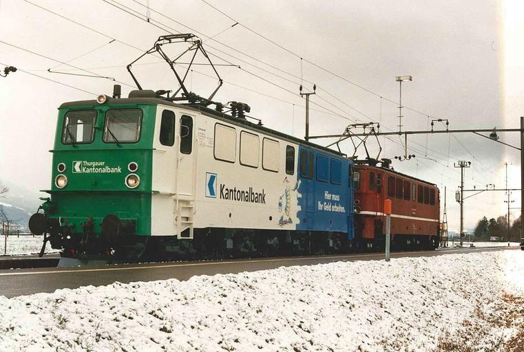 | Keywords: lok lokomotive schnee tkb schweizerischesüdostbahnag sob südostbahn schweiz suisse switzerland bahn zug eisenbahn railway train chemindefer suedostbahn trains eisenbahnen rail railroads railroad railways svizzera vehicle outdoor locomotive Die Werbelok der Thurgauer Kantonalbank TKB am 7. März 1995 bei Bollingen Quelle: Bildarchiv Helmut Marti, vielen Dank dafür Die Werbelok der Thurgauer Kantonalbank TKB am 7. März 1995 bei Bollingen Quelle: Bildarchiv Helmut Marti, vielen Dank dafür | ||||