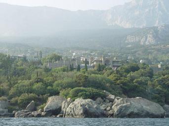 Keywords: Vorontsovsky palace seaside.JPG en View on Vorontsovsky palace in Alupka Crimea from sea ru Вид на Во онцовский дво ец с мо я own Eudjinnius 2007-08-01 18 20 28 Vorontsovsky Palace Crimea