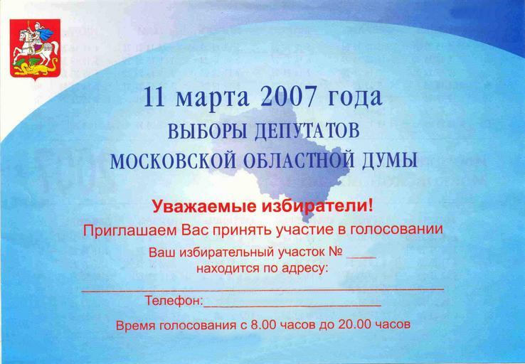 | Keywords: Voter invitation Moscow Oblast 2007.jpg  Russian voter invitation card Moscow Oblast Duma elections March 11 2007 Obverse П иглашение РФ на выбо ы депутатов  осковской Областной Думы 11 03 2007 Лицевая сто она own collection 2007 Moscow Oblast Electoral Commission PD-RU-exempt 11 March Voter invitation cards Elections in Russia 2007 |
