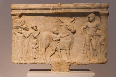 | Keywords: Votive relief NAMA3952.jpg en Votive relief Marble Found at river Ilissos Athens It has the form of a naiskos with pilasters an epistyle and a cornice Heartless is depicted at the right holding the lion pelt and the club In the centre a bull is led to sacrifice by a servant At the left a family of worshipers with their maidservant who carries a basket The inscription says Panis Aigiros to Herakles Probably from the sanctuary of Herakles in Kynosarges 4th century BCE N°3952 fr Bas-relief votif en marbre Trouvé dans la rivière Ilissos à Athènes Il a la forme d'un Naiskos avec pilastres epistyle et corniche Il montre Heracles à droite avec la peau du lion de Némée et sa massue Au centre un taureau est conduit au sacrifice Derrière vient la famille des donateurs avec une servant portant un panier L'inscription votive mentionne de Panis Aigiros à Héraklès Stèle provenant probablement du temple d'Héraklès à Kynosarges IVème siècle avant J -C n°3952 institution National Archaeological Museum of Athens 2015-05-20 16 14 55 own Jebulon other versions cc-zero Uploaded with UploadWizard Ancient Greek votive reliefs in the National Archaeological Museum of Athens 4th-century BC reliefs in Athens Reliefs of bulls Reliefs of Heracles Naiskoi Ilissos river National Archaeological Museum of Athens 3952 Quality images by Jebulon QualityImage |