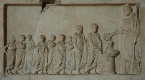 | Keywords: Votive relief sacrifice Louvre Ma756.jpg Sacrifice of a goat seven ephebes on the left two bearded men priests or magistrates and a servant laying down offerings on the altar; the goddess on the right maybe Demeter holds a scepter and an omphalos phiale Sacrifice d'une chèvre sept éphèbes à gauche deux hommes barbus des prêtres ou des magistrats et un serviteur déposant des offrandes sur l'autel ; la déesse peut-être Déméter à droite tient un sceptre et une phiale à omphalos cm 56 111 ca 340 320 BC Pentelic marble Institution Louvre Department of Greek Etruscan and Roman Antiquities Denon wing ground floor room 9 20220 object history Marquis de Nointel ProvenanceEvent purchase Académie des inscriptions ProvenanceEvent seized French Revolution ProvenanceEvent transferred Musée des monuments français credit line ProvenanceEvent purchased 1803 Musée des monuments français accession number Ma 756 MR 837 own photo date 2006 Marie-Lan Nguyen artwork license PD-old-100 photo license other versions 4th-century BC reliefs in Paris 2nd-century BC reliefs in Paris Religion in ancient Greece Ephebes Pentelic marble sculptures Nointel Collection Greek antiquities in the Louvre - Room 8 Ancient Greek reliefs Reliefs of servants Paris Sacrifice in ancient Greece and Rome Libation in ancient Greece and Rome |