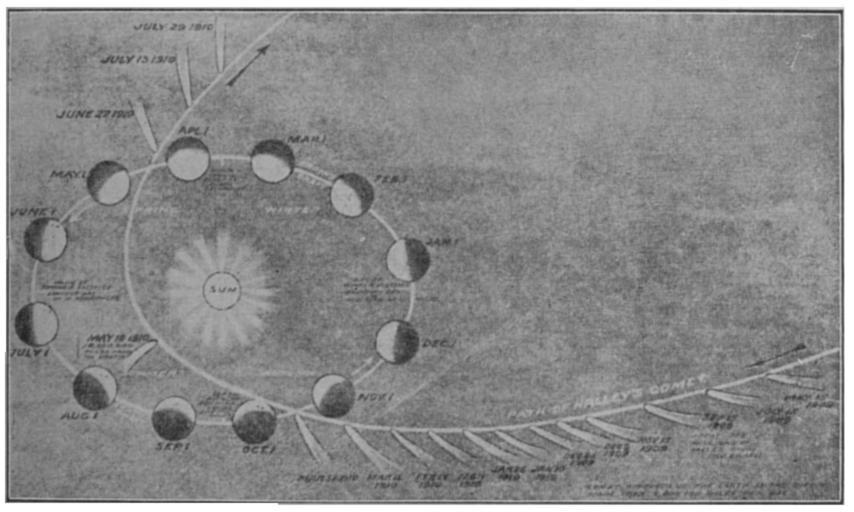 | Keywords: Voyage in Space page019.jpg en How the Earth and Halley's Comet move round the Sun Taken from Illustrated London News for Sept 25 1909 A Voyage in Spacehttps //archive org/details/voyageinspacecou00turnrich Herbert Hall Turner 1913 1930 A Voyage in Space Orbits of comets Earth's orbit |