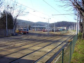 Keywords: Vozovna z Hlinek.JPG Tram depot in Pisárky seen from Hlinky Street Т амвайное депо Писа ки в Б но 2008-01 Own zarco Vozovna Pisárky Tram 1088 Brno Tram track Nové sady - Pisárky