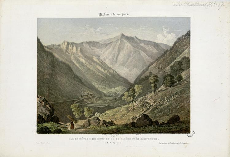 | Keywords: Vue de l'établissement de la Raillière près Cauterets (Hautes-Pyrénées) - Fonds Ancely - B315556101 A MERCEREAU 7 026.jpg Impression en 3 coul par Frick frères à Paris Fait partie d'un ensemble de recueils de lithographies de Mercereau composés de lithographies provenant de La France de nos jours vaste suite publiée par livraisons de 1853 à 1876 et comprenant 475 planches en deux tirages l'un à deux teintes noir et bistre l'autre en couleurs Les libraires ont réuni ces planches en albums de composition variable quant au nombre de planches et aux dessinateurs Asselineau Mercereau Maurice Deroy etc Un titre Les Pyrénées par Ch Mercereau; Bagnères-de-Luchon par Ch Mercereau était frappé sur le plat supérieur de la reliure de l'album ainsi que le nom du Libraire pour lequel il était réalisé La plupart des recueils de ces planches pyrénéennes portent le nom de Sajous libraire à Bagnères-de-Luchon Pl 1 à 18 numérotées de 370 à 386 Pl 374 pl 5 et 6 en double -- Pl 19 20 et 21 numérotées respectivement 407 415 et 418 Ces trois pl ont été dessinées et lithographiées par Asselineau -- Pl 22 23 et 24 numérotées 438 439 et 440 -- Pl 22 lith par Aubrun -- Pl 25 numérotée 441 -- Pl 26 à 40 numérotées de 327 à 341 -- Pl 41 à 46 numérotées de 363 à 368 -- Pl 47 numérotée 369 -- Pl 48 num 292 -- Pl 49 et 50 num 264 et 265 -- Pl 51 et 52 num 268 et 269 -- Pl 53 à 55 num de 293 à 295 -- Pl 56 num 300 -- Pl 57 à 59 num de 307 à 309 -- Pl 60 à 70 num de 316 à 326 -- Pl 71 num 63 dessin et lith d'Asselineau imprimerie Destouches -- Pl 72 et 73 num 87 et 88 dessin et lith d'Asselineau imprimerie Destouches -- Pl 74 num 124 signée Lebreton éditée chez Lalonde à Paris et imprimée chez Becquet frères à Paris -- Pl 75 num 161 dessin et litho d'Asselineau imprimerie Destouches --Pl 76 à 78 num de 207 à 209 -- Pl 79 à 81 num de 211 à 213 -- Pl 82 num 220 dessin et lith de Maurice imprimerie Destouches -- Pl 83 à 86 num de 226 à 229 -- Pl 87 et 88 num 234 et 235 -- Pl 89 à 91 num de 273 à 275 -- Pl 92 et 93 num 290 et 291 Pièces jointes 6 pl sépia dont certaines sont des doubles du recueil de Mercereau Les cinq premières planches sont numérotées respectivement 318 321 324 331 386 La dernière planche n'est pas extraite de La France de nos jours mais de L'Espagne pittoresque et monumentale Ces six planches sont signées Mercereau éditées chez Sinnet et imprimées chez Frick frères Ancely René 1876 - 1966 Possesseur fre public domain domaine public B315556101_A_MERCEREAU_7_026 jpg image/jpeg 1 f de pl lithogr ; 31 cm oblong Frick frères Imprimeur Sinnet F Éditeur http //numerique bibliotheque toulouse fr/collect/general/index/assoc//ark /74899/B315556101_A_MERCEREAU_7_026 dir/B315556101_A_MERCEREAU_7_026 jpg Bibliothèque municipale de Toulouse A-MERCEREAU 7-26 Creator Charles Mercereau http //catalogues toulouse fr/web2/tramp2 exe/do_keyword_search/log_in setting_key BMT1 servers 1home query p001650 St Jean-de-Luz intérieur de l'Eglise St Jean-de-Luz le Château de l'Infante Biarritz Vue générale prise du Phare Château de Mauvesin près Bagnères-de-Bigorre Hautes Pyrénées Bagnères de Bigorre Hautes Pyrénées - Intérieur de l'Eglise des Carmes en couleurs Bagnères de Bigorre Hautes Pyrénées - Intérieur de l'Eglise des Carmes Bagnères-de-Bigorre - Eglise et couvent des Carmes Bagnères-de-Bigorre Hautes-Pyrénées - Tour des Jacobins Cascade et Pont de Magenta Vallée de l'Esponne Hautes Pyrénées Cascade de Trémes-Aïgues Vallée de Grip Hautes Pyrénées St Sauveur Hautes Pyrénées - Le Pont Napoléon Bayonne - Eglise St André Arreau et la Vallée d'Aure Hautes Pyrénées - Vue prise au dessus de la route du Col d'Aspin Auch - Vue prise sur les bords du Gers Auch - Vue de la Cathédrale Auch - Intérieur de la Cathédrale Bagnères-de-Bigorre - Vue Générale prise de la Fontaine ferrugineuse Eaux-Bonnes Basses-Pyrénées - L'établissement Thermal et la Chapelle Nantes - Vue de l'Eglise Ste Croix Le Croisic - Plage des Baigneurs et Etablissement de Bains Le Folgoët - Vue de l'Eglise Brèche de Roland prise de Gèdres Hautes Pyrénées Eglise des Templiers à Luz Chapelle du couvent de Pouëlahun i e Pouey Lahun - Vallée d'Azun Hautes Pyrénées Le Pont de Scia - Route de Luz à Gavarnie Hautes-Pyrénées Vue générale de Cauterets prise du Mamelon Vert Hautes-Pyrénées Vue du Fort de Lourdes Hautes-Pyrénées Vue d'Argelès-de-Bigorre Hautes-Pyrénées Vue de St Sauveur Hautes-Pyrénées Le Pas de l'Echelle Route de Gavarnie Hautes-Pyrénées Fond de la Vallée d'Argelès prise de la terrasse de St Savin Hautes-Pyrénées Place Grammont à Pau Basses-Pyrénées Vue générale des Eaux-Bonnes Basses-Pyrénées Barèges et la Vallée du Bastan Hautes-Pyrénées Chute supérieure du Pont d'Espagne Hautes-Pyrénées La grotte miraculeuse à Lourdes Hautes-Pyrénées Eglise de Bétharram et Pont de Lestelle Basses Pyrénées Cascade du Cerizet Près Cauterets Hautes-Pyrénées Pic du Midi d'Ossau 2885m Basses Pyrénées - Vue prise du 3e plateau de Bious-Artigues Pau - Vue prise de la terrasse du Château Toulouse - Cloître du Musée Galerie du Moyen-Age Pau - Vue du Château prise du Parc Toulouse - Cloître du Musée et Clocher des Augustins Toulouse - La maison de pierre fragment de la façade Toulouse - Intérieur de St Sernin St Jean-de-Luz Fort du Socoa Toulouse - Vue du Capitole Bordeaux Vue de la Porte du Caillau i e Cailhau Bordeaux Porte de la grosse Cloche Bordeaux Vue des Quinconces Bordeaux - Vue de la Tour et de l'Eglise de St Michel Toulouse - Vue du Pont de pierre prise du Quai de Brienne Toulouse - Abside de l'Eglise de St Sernin de l'an 1097 Toulouse - Choeur de la Cathédrale St Etienne Rouen - Hôtel de Bourgtheroulde Biarritz - Vue des Bains Napoléon et du Casino Biarritz - Vue des Bains du Port Vieux Biarritz - Vue de l'Entrée de la Ville à l'arrivée de Bayonne Le Lac Bleu Hautes-P