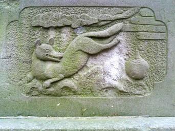 | Keywords: Wada-inari-jinja5 relief.jpg 神使狐像 阿形(あぎょう 向かって右)の台石部分に刻まれたレリーフ彫刻 稲荷神の神使としての狐の姿が の や 珠と共に彫描かれている 和田稲荷神社にて 制 :明治33(1900)年 Stone relief of Inari fox - on a base stone under the fox statue at Wada Inari-jinja in Shakujii-machi near Shakujii-kōen Station Nerima ward Tokyo Japan Kitsune a fox as a guardian animal of Inari with a branch of pine tree liefs and a peach-like /onion-shaped object on the right side is a hō・ju which is believed that it has a power to make wishes come true own 2008-04-21 tokorokoko <gallery align right> File Wada-inari-jinja3 date jpg File Wada-inari-jinja6 shirakashi jpg </gallery> 35 741864 139 607273 region JP-13 Wada Inari-jinja Shakujii Nerima Inari fox statues z Reliefs of animals in Japan Reliefs of foxes PD-Japan |