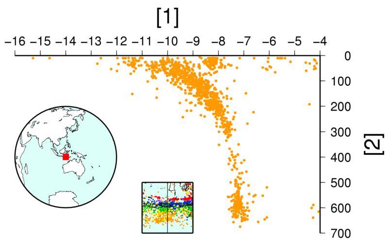 | Keywords: Wadati-Benioff zone.png andre315 PD-USGov-Interior-USGS Data source http //neic usgs gov/ USGS-NEIC <br/> Created the 9th February 2007 with the free http //gmt soest hawaii edu/ GMT software <br/> 10 The Wadati-Benioff zone under the Lesser Sunda Islands latitude in degree hypocentre depth in km This plot shows the earthquake localizations on a South-North cross section for the lat -14°/-4° lon 114°/124° quadrant red square on the globe corresponding to the Lesser Sunda Islands region The localizations are extracted from the USGS database and corresponds to magnitude greater than 4 5 in the 1973-2004 time period shallow earthquakes with undetermined depth have been omitted La zone de Wadati-Benioff sous les Petites Îles de la Sonde Latitude en degrés Pronfondeur des hypocentres en km Ce shéma montre la localisation des tremblements de terre sur une section Sud-Nord de la région des Petites Îles de la Sonde carré rouge sur le globe Ces localisations sont extraites de la base de données de l'USGS et correspondent aux séismes de magnitude supérieur à 4 5 durant la période 1973-2004 les séismes superficiels ayant une profondeur non contrainte n'ont pas été représentés Seismograms |