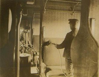 Keywords: Wagon odkurzanie Barry Kent.jpg En icon Inside a train cart<br>Scaned and uploaded by Robert Wielgórski Barry Kent <br> Pl icon Odkurzanie siedzeń w wagonie Railway Museum in Warsaw 1913 author PD-old Rail transport staff