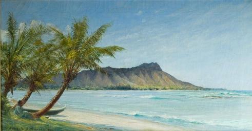 | Keywords: 'Waikiki Beach in Sunlight' by D. Howard Hitchcock, 1896.JPG Waikiki Beach in Sunlight by D Howard Hitchcock 1896 oil on canvas 16 x 30 inches Frazier Fine Art 1896 D Howard Hitchcock PD-old-auto 1943 Hawaii in paintings by D Howard Hitchcock Diamond Head in art Hitchcock Paintings of palms Oil paintings of seascapes 1896 paintings |