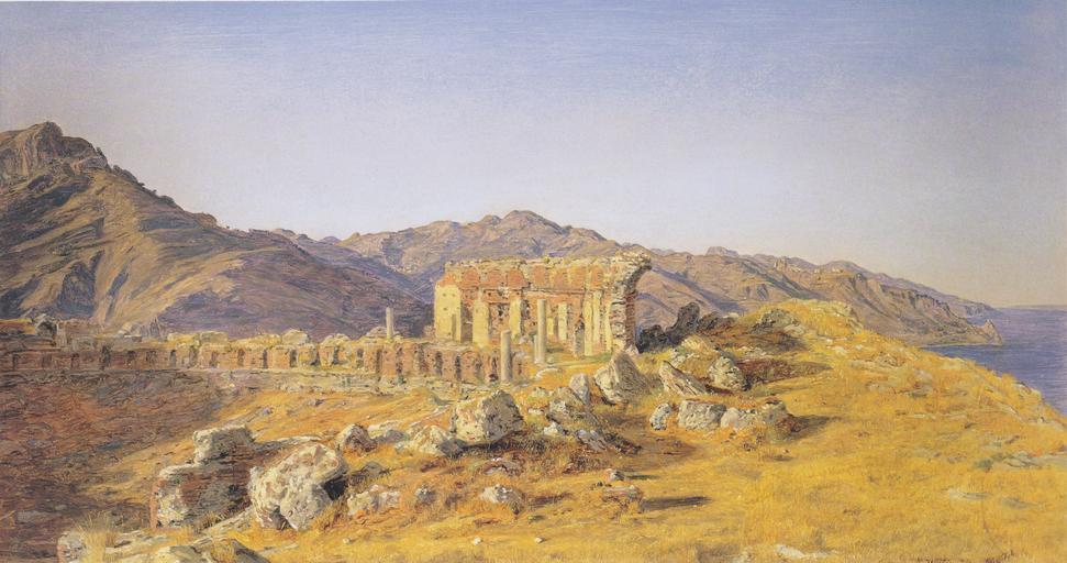 | Keywords: Waldmüller - Ruine des griechischen Tempels zu Taormina gegen die Meerenge von Messina.jpeg Artwork title Ruine des griechischen Tempels zu Taormina gegen die Meerenge von Messina Ruins of Greek temple in Taormina on the Strait of Messina <br>25px PAY ATTENTION The painting shows the ruins of the ancient theatre of Taormina not of a temple <small>--DenghiùComm <span class signature-talk ></span> 19 29 4 April 2015 UTC </small> Oil on wood cm 18 31 Liechtenstein Museum Feuchtmüller-WV-Nr 710 repro from artbook 1844 Creator Ferdinand Georg Waldmüller PD-old-100 Other versions Paintings by Ferdinand Georg Waldmüller 1844 1844 paintings Waldmüller Ancient Greek theatre of Taormina in art Paintings in the Liechtenstein Museum 19th-century paintings Ruins in art |