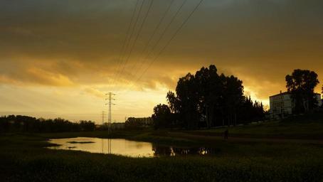 Keywords: walk landscape puddle field campestre outside pond water reflection afternoon clouds cloudy path cables power lines darken trees distant return