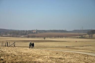 Keywords: walk walkers go for a walk nature away landscape winter together trail road personal pair couple church steeple rural land field germany southern germany baden württemberg on the go man woman community go wide sky