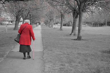 Keywords: walking old people coat age park walk background season light effect lady red