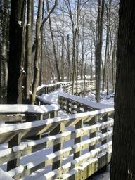Keywords: walkway path wooden rails snow winter cold ice frozen season woods