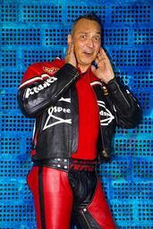 Keywords: wall blue human man leather jacket leather pants leather suit portrait surprised horror