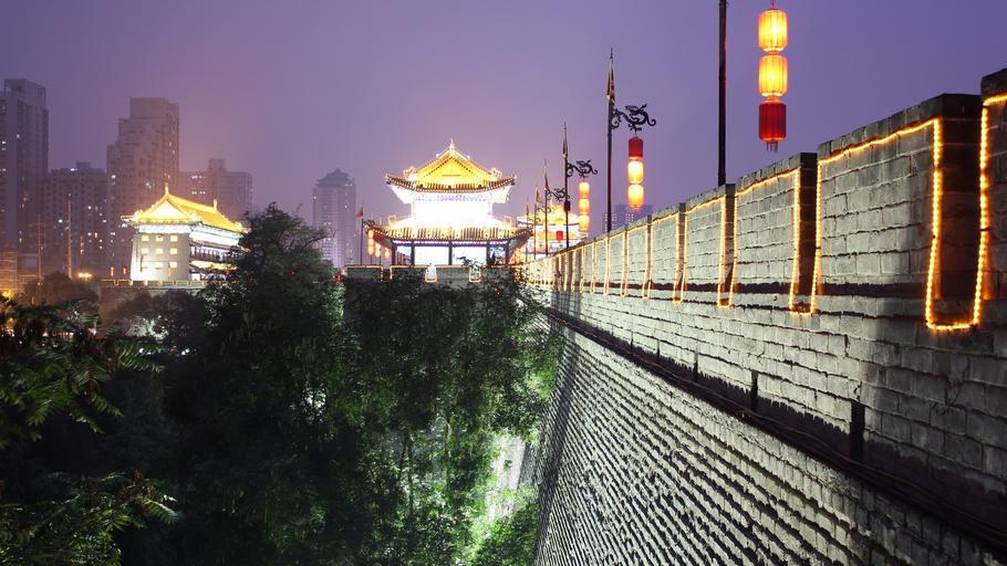 Keywords: wall china night lights pagoda urban xi'an xi'an city wall street city skyscrapers fog dust lanterns trees