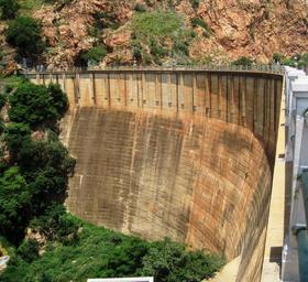 Keywords: wall dam tall wide strong stained concrete railing greenery mountain side