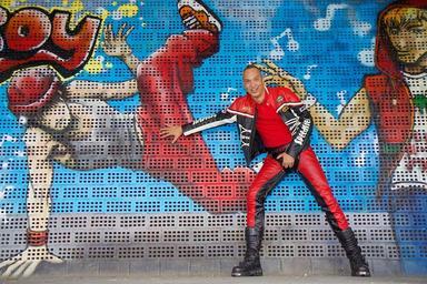 Keywords: wall grafitti human man leather jacket leather pants leather suit portrait play