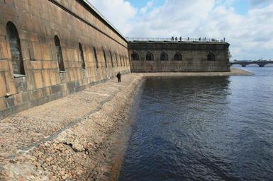 Keywords: wall tall strong grey-brown arched openings walkway cobbled lone stroller defense protection river water