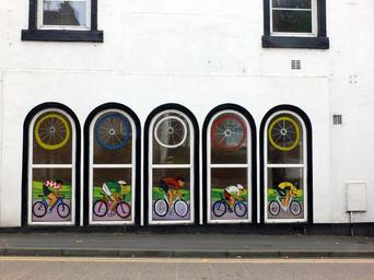 Keywords: wall white building windows paintings cyclists art artistic decor pavement