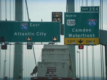 Keywords: Walt Whitman Bridge EB approaching US 130 NB-I-676.JPG Eastbound Walt Whitman Bridge approaching the exit for northbound U S Route 130/Interstate 676 exit 354 in Gloucester City New Jersey Own 2008-07-23 Dough4872 Walt Whitman Bridge