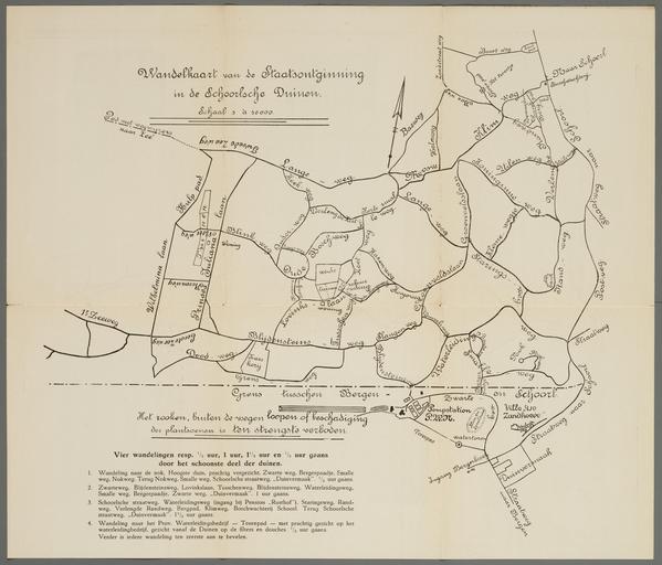 | Keywords: schoorl Wandelkaart van de Staatsontginning in de Schoorlsche Duinen, met linksonder een beschrijving van vier wandelroutes. Vervaardiger: Onbekend Catalogusnummer: PR 1004188 Wandelkaart van de Staatsontginning in de Schoorlsche Duinen, met linksonder een beschrijving van vier wandelroutes. Vervaardiger: Onbekend Catalogusnummer: PR 1004188 |