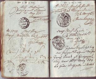 | Keywords: Wanderbuch journeyman Wobrausky from Daschitz 15.jpg Wanderbuch eines Kürschner-Gesellen Wanderbuch in Folge allerhöchsten Patents vom 24 Februar 1827 Für Anton Wobrausky von Daschitz aus Böhmen Chrudimer Kreis Seite 30-31 Wandrownická knizka die nevwysssjho patentu ob 24 vnora 1827 Travelling book of a Czechoslovakian furrier Page 30-31 from own possession 1827 First notice 18 März 1832 Last notice 8 August 1848 --Kürschner <span class signature-talk >talk</span> 19 53 19 February 2009 UTC thumb thumb thumb thumb See also/siehe auch Kürschner Wanderbücher PD-old Furs literature German Wanderbuch des Kürschner-Gesellen Wobrausky aus Daschitz |