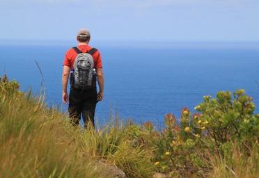 Keywords: wanderer sea hiking vision landscape sky nature away distant wide outlook distance foresight summer blue partly cloudy viewpoint man look view distant view plant vegetation backpack