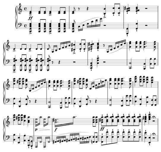 | Keywords: WandererFantasie-Schubert-Introduction.svg Introduction to Franz Schubert's piano fantasia D 760 File generated from the SVG output of Lilypond using the following file <pre> \header title Wanderer Fantasie D 760 subtitle Introduction source IMSLP00886 Leipzig Breitkopf Härtel 1884-1897 Plate F S 108 composer Franz Schubert 1797-1828 copyright Public Domain \version 2 10 \score \new PianoStaff << \new Staff \clef treble <c' e'>4\ff-> <c' e'>8 <c' e'>8 <c' e'>4-> <c' e'>8 <c' e'>8 <c' e'>8 r8 r4 <b b'>4- -> <c' c>8- <c' c>8- <f' g' b' cis>4- <f' g' b' d>4- r2 \break d'4-> d'8 d'8 d'4-> d'8 d'8 d'8 g16 b16 d'16 f'16 g'16 b'16 <cis' cis>4- -> <d' d>8- <d' d>8- <dis' g' c dis>4- <e' g' c e>4- r8 g16 c'16 e'16 g'16 c16 e16 <g' e g>4 <g' e g>8 <g' e g>8 <g' d g>4 <g' d g>8 <c g c>4 <c fis c>8 <c fis c>8 <b' g b>8 g16 c'16 e'16 g'16 c16 e16 <g' e g>4 <g' e g>8 <g' e g>8 <g' d g>4 <g' d g>8 <c g c>4 <c fis c>8 <c fis c>8 <b' g b>8 c'16 f'16 a'16 c f a <c a c>4 <c a c>8 <c a c>8 <c g c>4 <c g c>8 <f c f>4 <f b f>8 <f b f>8 <e b e>4 <e a e>4 <d a d>4 <d gis d>8 <d gis d>8 <c a c>4 <a' c a>4 \repeat tremolo 4 <a' e>16\p\> a16 \repeat tremolo 4 <a' e>16 a16\ \repeat tremolo 4 <a' dis>16 \f a16 <a' dis a>8 <a' dis a>8 <a' dis a>8- \ff <b' dis a b>8- <b' dis a b>8- <b' dis a b>8- <b' dis a b>8- <b' dis a b>8- <b' dis a b>8- <b' dis a b>8- <b' e gis b>4- <e gis b e>4- r2\fermata \new Staff \clef bass <c g c e g>4-> <c g c e g>8 <c g c e g>8 <c g c e g>4-> <c g c e g>8 <c g c e g>8 <c g c e g>8 c16 e g c' e' g' r2 <g g >4- <g g>4- r2 \break <g g f g b>4-> <g g f g b>8 <g g f g b>8 <g g f g b>4-> <g g f g b>8 <g g f g b>8 <g g f g b>8 r8 r4 r2 <c g c>4- <c g c'>4- r2 <c c>2 <b b >4 <b b>8 <b b>8 <a a>4 <d d>4 <g g>8 r8 r4 <c c>2 <b b >4 <b b>8 <b b>8 <a a>4 <d d>4 <g g>8 r8 r4 <f f>2 <e e>4 <e e'>8 <e e'>8 <d d'>4 <g g>4 <c c'>4 <f f>8 <f f>8 <b b>4 <e e>4 <a a>4 <a a >8- <g g >8- \repeat tremolo 4 f 16 f 16 \repeat tremolo 4 f 16 f 16 fis 16 g 16 gis 16 a 16 ais 16 b 16 c16 cis16 d16 dis16 e16 f16 <f f>8 <f f>8 <f f>8- <f f'>8- <f f'>8- <f f'>8- <f f'>8- <f f'>8- <f f'>8- <f f'>8- <e e'>4- <e e>4- r2\fermata >> \midi \context \Score tempoWholesPerMinute ly make-moment 144 4 </pre> Rework with Inkscape removed text and converted all objects to paths updated some items then saved as simple SVG en Franz Schubert's piano fantasia D 760 introduction fr Introduction de la fantaisie pour piano D 760 de Franz Schubert Own Romainbehar 2008-10-06 GNU LilyPond images Der Wanderer Images with LilyPond source code Sheet music for piano |