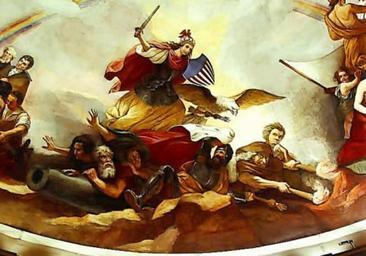 | Keywords: War in The Apotheosis of Washington.jpg War Armored Freedom sword raised and cape flying with a helmet and shield reminiscent of those on the Statue of Freedom tramples Tyranny and Kingly Power; she is assisted by a fierce eagle carrying arrows and a thunderbolt Architect of the Capitol information webpage http //www aoc gov/cc/art/rotunda/apotheosis/apoth_war cfm Architect of the Capitol Public domain work of the United States federal government PD-USGov The Apotheosis of Washington Columbia |