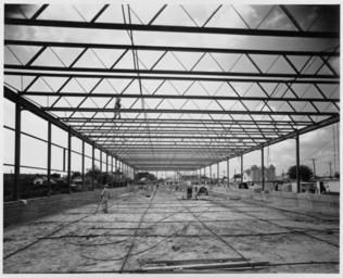 | Keywords: steel steel industry steelindustry steel construction steelconstruction construction industry constructionindustry construction equipment constructionequipment buildings blackandwhite monochrome photo border building architecture building structure black and white Photograph of a warehouse and office building during construction. The building was constructed by Alco Products, Inc. out of Beaumont using materials provided by John Dollinger Jr., Inc. The steel framing has been completed and workers appear to be sweeping the area, which is a dirt floor. An additional man is walking across a beam at the top of the photograph. Houses and a large building are in the background. Photograph of a warehouse and office building during construction. The building was constructed by Alco Products, Inc. out of Beaumont using materials provided by John Dollinger Jr., Inc. The steel framing has been completed and workers appear to be sweeping the area, which is a dirt floor. An additional man is walking across a beam at the top of the photograph. Houses and a large building are in the background. |