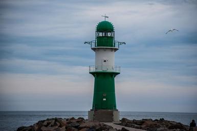 Keywords: warn mouths harbor lighthouse green baltic rostock germany sky grey fog boats fairway information light bright yellow mecklenburg larboard shipping characters starboard tower warning water waterway