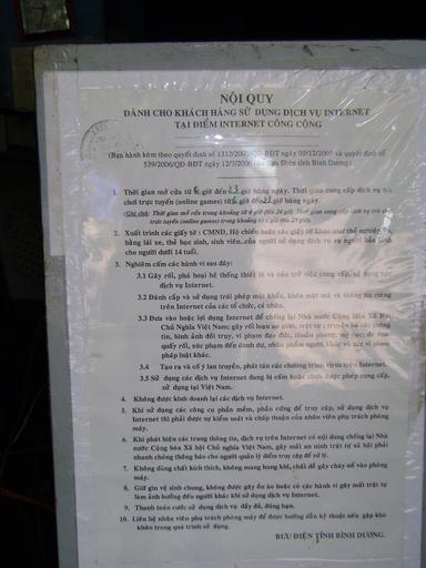 | Keywords: Warning in Internet Cafe in Thu Duc, Vietnam-2.jpg A list of rules for users at an Internet cafe posted in Thu Duc Ho Chi Minh City Vietnam Transferred from http //en wikipedia org en wikipedia; transferred to Commons by User Liftarn using http //tools wikimedia de/~magnus/commonshelper php CommonsHelper <br/> Original text I created this work entirely by myself June 22 2008<br/> 2008 06 22 original upload date Kauffner talk Original uploader was Kauffner at http //en wikipedia org en wikipedia Released into the public domain by the author en wikipedia Kauffner Original upload log page en wikipedia Warning_in_Internet_Cafe_in_Thu_Duc 2C_Vietnam-2 jpg 2008-06-22 17 53 Kauffner 2304×3072× 2734520 bytes <nowiki> A warning in an internet cafe in Thu Duc HCMC I created this work entirely by myself June 22 2008 ~~~ </nowiki> Internet censorship Communication in Vietnam |