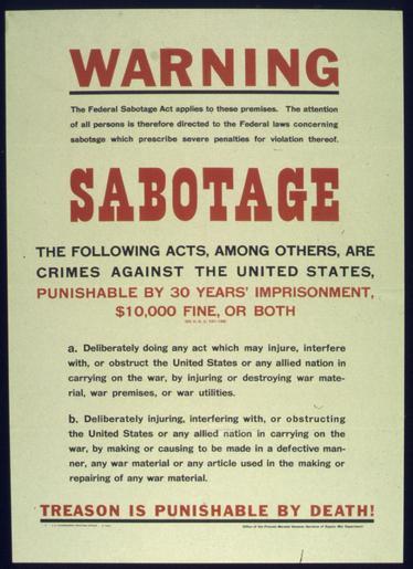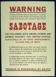 | Keywords: "WARNING...SABOTAGE. THE FOLLOWING ACTS, AMONG OTHERS, ARE CRIMES AGAINST THE UNITED STATES...TREASON IS PUNISHABLE... - NARA - 516041.tif Scope and content General notes 516041 Local identifier 44-PA-2315 Office for Emergency Management Office of War Information Domestic Operations Branch Bureau of Special Services 03/09/1943 - 09/15/1945 Still Picture Records Section Special Media Archives Services Division NWCS-S National Archives at College Park 8601 Adelphi Road College Park MD 20740-6001 1941 - 1945 Record group Record Group 44 Records of the Office of Government Reports 1932 - 1947 Record group ARC 373 World War II Posters compiled 1942 - 1945 Series ARC 513498 File unit File unit ARC Variant control numbers NAIL Control Number NWDNS-44-PA-2315 yes Other versions <gallery> File WARNING SABOTAGE _THE_FOLLOWING_ACTS _AMONG_OTHERS _ARE_CRIMES_AGAINST_THE_UNITED_STATES TREASON_IS_PUNISHABLE _-_NARA_-_516041 tif tif File WARNING SABOTAGE _THE_FOLLOWING_ACTS _AMONG_OTHERS _ARE_CRIMES_AGAINST_THE_UNITED_STATES TREASON_IS_PUNISHABLE _-_NARA_-_516041 jpg jpg </gallery> NARA-cooperation PD-USGov World War II posters from the United States Sabotage NARA TIF images with categorized JPGs |
