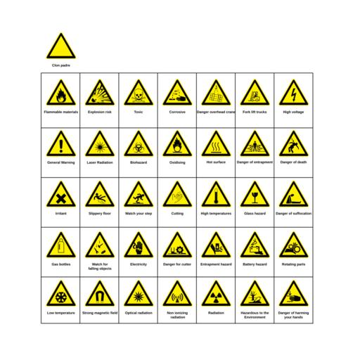 Keywords: warnings hazards danger symbols signs safety chemical poison explosion slippery corrosive flammable explosive overhead forklift oxidizing entrapment alkali acids radiation fall laser