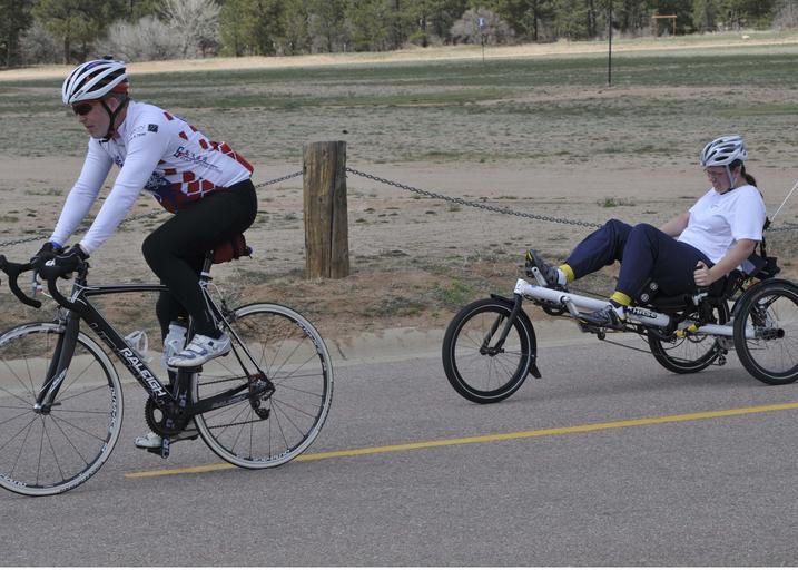 | Keywords: Warrior Games 2013 Cycling Practice 130506-N-DT940-012.jpg en Retired Aviation Technician 3rd Class Kathleen Ray and her cycling coach Rick Babington ride the cycle course at the Air Force Academy here May 6 in preparation for the 2013 Wounded Warrior Games The Warrior Games includes competitions in archery cycling seated volleyball shooting swimming track and field and wheelchair basketball The goal of the Warrior Games is not necessarily to identify the most skilled athletes but rather to demonstrate the incredible potential of wounded warriors through competitive sports More than 200 wounded ill or injured service members from the U S and U K armed forces are scheduled to compete in the Paralympics-style competition May 11-16 U S Navy photo by Mass Communication Specialist 1st Class Erica R Gardner/Released <br>Unit Navy Wounded Warrior -- Safe Harbor 2013-05-06 Petty Officer 1st Class Erica R Gardner https //www dvidshub net/image/929525/warrior-games-2013-cycling-practice 130506-N-DT940-012 2013-05-11 19 24 COLORADO SPRINGS CO US PD-USGov-Military-Navy Warrior Games Images from DoD uploaded by Fæ |