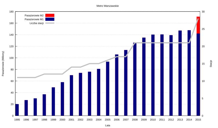 Keywords: Warsaw-Metro-Passengers-pl.svg Metro warszawskie liczba pasażerów i stacji http //www metro waw pl/pliki/aktualnosci/2016/rr2015/rr2015 pdf Raport Roczny Metra Warszawskiego 2015 File talk Warsaw-Metro-Passengers-en svg zawiera dane i skrypt gnuplot Sliwers 2016-10-30 File Warsaw-Metro-Passengers-en svg Created with Gnuplot Metro in Warsaw “ charts |