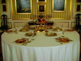| Keywords: Warsaw Royal Castle GM (20).JPG - Gate-leg table mahogany England 1750 On the table - Centerpiece silver gift master PC London 1801-1802 - Four bowls silver Teodor Pawlowicz Warsaw 1784-94; The Ciechanowiecki Foundation Collection - Pair of bowls with covers silver Teodor Pawlowicz Warsaw 1789 - Six dessert plates gilded brass silver XIX century The Ciechanowiecki Foundation Collection - Six spoons knives and forks silver Paris 1819-1838; The Ciechanowiecki Foundation Collection - Six spoons knives and forks gilded brass XIX century; The Ciechanowiecki Foundation Collection - Six goblets glass Poland c 1800 The Ciechanowiecki Foundation Collection - Eight-lights chandelier Central Europe c 1750; bequeated by Tadeusz Wierzejski Own 2008-06 Giorgiomonteforti Own work all rights released Public domain Wallpapered rooms Round tables Dining tables Table settings Silver tableware Centrepiece tableware Silverware from England Silverware from Poland Silverware from France Yellow Room Royal Castle Warsaw |