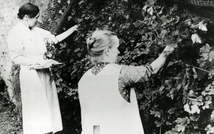 Keywords: the women's library thewomenslibrary hires blackandwhite black and white 5FWI/B/2/2/02/008 Photograph, printed paper, monochrome, two women picking netted gooseberries, garden wall in background. 5FWI/B/2/2/02/008 Photograph, printed paper, monochrome, two women picking netted gooseberries, garden wall in background.