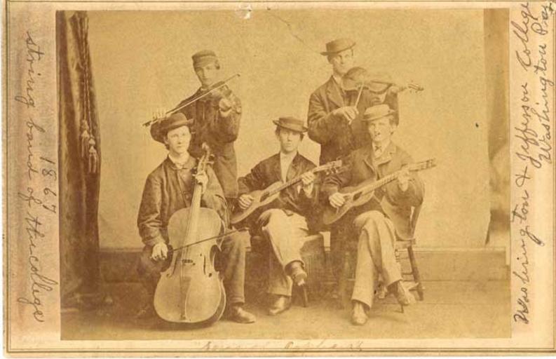 | Keywords: Washington & Jefferson string band 1867.jpg A string band at w Washington Jefferson College http //www washjeff us/forum/groups/images/String_B001 jpg at http //www washjeff us/forum/groups/String_B001 html String Band Washington Jefferson College 1867 1867 Author PD PD-Old Washington Jefferson College Washington Jefferson College in the 1860s |