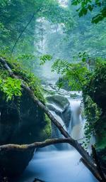 Keywords: water bach nature forest tree moss water running flow mood waterfall murmur waters rock idyll stones romantic idyllic cold green blue fog haze moist