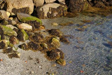 Keywords: water bank lake landscape stones clear water clean water seaweed soul quiet nature calming mood ebb flood fjord norway holiday