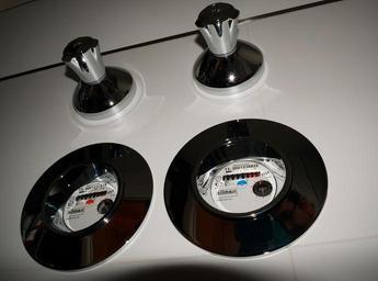 Keywords: water clock bad fittings shiny bright silver white faucet vignetting wide angle distorted light shadow district mirroring mirror image sanitary