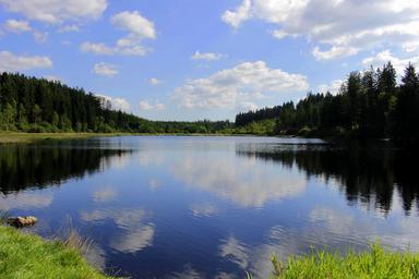 Keywords: water clouds sky nature moor mirroring landscape lake trees green seascape rest pond meadow idyllic forest nature conservation