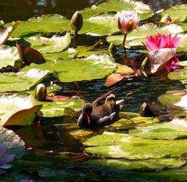 Keywords: water lilies lilies water pond monet garden nature green animals water plan moorhen chick animal bird fauna