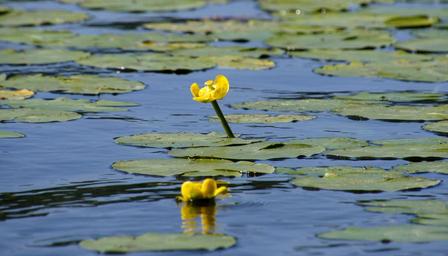 Keywords: water lily pond aquatic plant flower nature water leaves green water plan reflections yellow blue sunlight